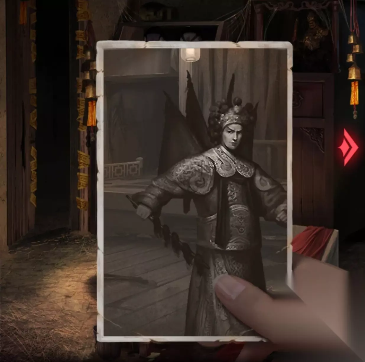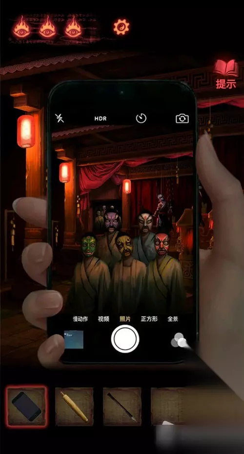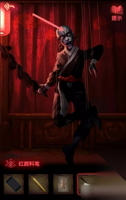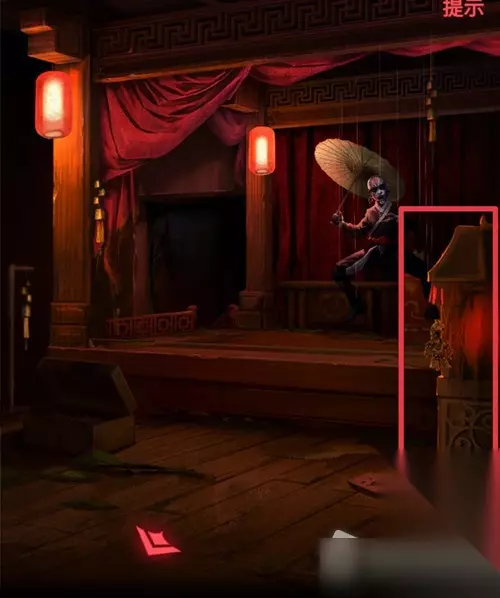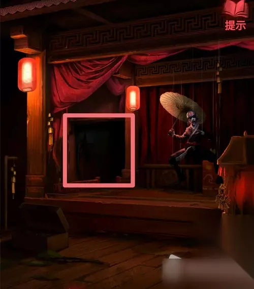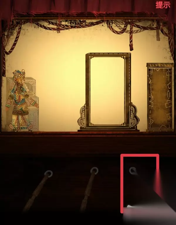 4.点击右边戏台的红布帘,距离拉近后再点一次(提示:前方有连续两次高能,胆小的小伙伴可以手机拿远一些再点击),出现一个被线挂着的木偶