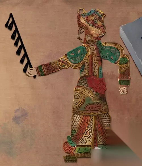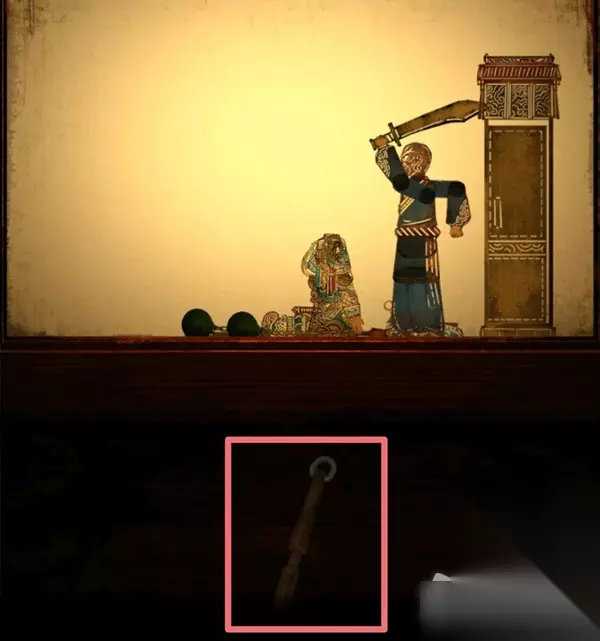 31.继续回到皮影戏台子,此时皮影的手里也多了一把长枪,点击中间的操作杆,梁少平把房顶的盒子戳掉下来