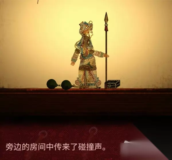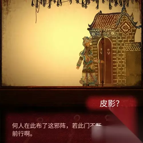 22.看完剧情,操纵皮影走到门的位置,皮影一脚踢开了门,继续控制皮影走,(提示:BGM小高能)然后地上会出现一对铁枷锁,皮影不能动了