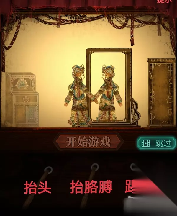 21.先一直点击下方的第三个操控棒,让皮影走到镜子那里,进行一个小游戏,需要快速根据镜子里的皮影动作做出一样的动作(1抬头,2抬胳膊,3踢腿)