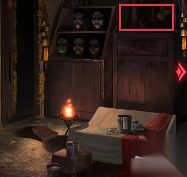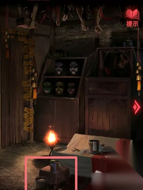 16.回到第一个房间,点击脸谱那,根据刚刚的提示调整脸谱的眼珠看的方向:↑↑,←←,→→,↑↑,↓↓