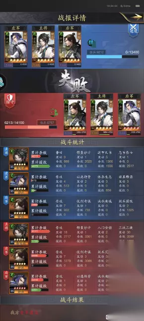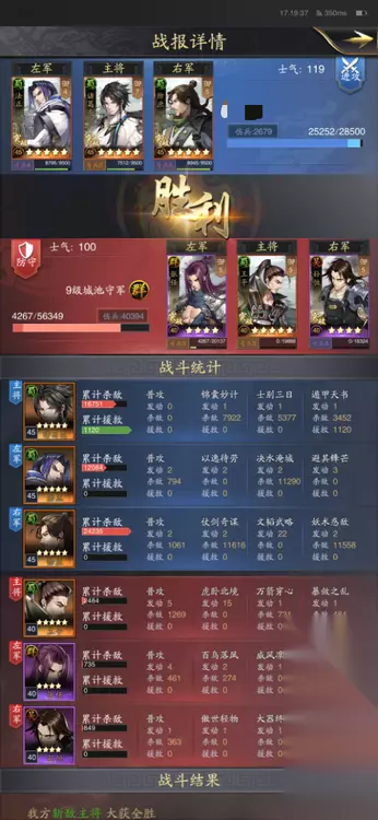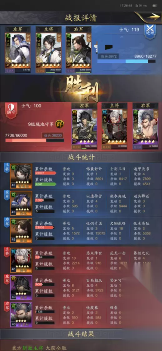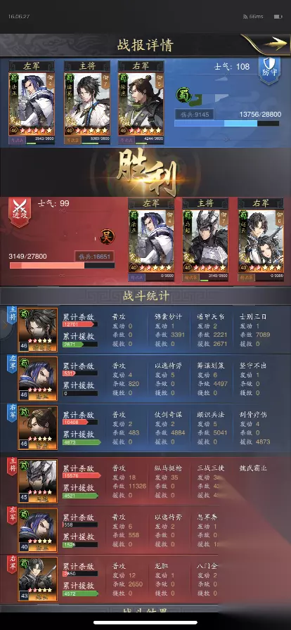 【对战】 正如之前所说,后期的蜀智阵容凭借兵力的提升和科技的升级,马超队等控制秒杀阵容已经很难克制它了,凭借【坚守不出】的减伤和【遁甲天书】【刮骨疗伤】的强力治疗,蜀智阵容有足够的时间来消耗击杀敌方武将,同时那些控制秒杀阵容多由武力、统御值较高的武将组成,其智力值是个短板,所以蜀智阵容的谋略伤害可以在后期对其造成大量的打击,一定程度上反向克制了武力阵容。 而蜀智队的内战就要考研两队的技能触发情况了,这时候一些黑科技也会起到不一样的效果,例如下图中胜利方的诸葛采用了三战三捷和八门金锁的武技搭配,单体伤害输出能力增强了很多,各位主公们在游戏中也可也尝试探索一下。