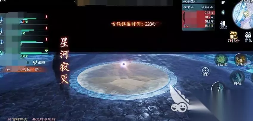 在这个强大的易伤基础上,还要全力堆叠增伤效果:焚香的“三昧真火”能提升全队50%伤害,天音的“无量真言”带来30%加成,再加上太昊法阵提供的10%增伤,三者叠加后稳稳覆盖了120%的增伤上限,最大化团队输出。 战斗开始后,太昊第一时间开启加速法阵优化全队节奏;焚香看准时机,首要任务就是施放“绝情殇”完成关键的增伤覆盖,增益到位后,青云立刻施展爆发技能“太极玄天真决”进行主力输出,最后由昭冥精准衔接“日月弘光”的第二段伤害进行补刀收尾。