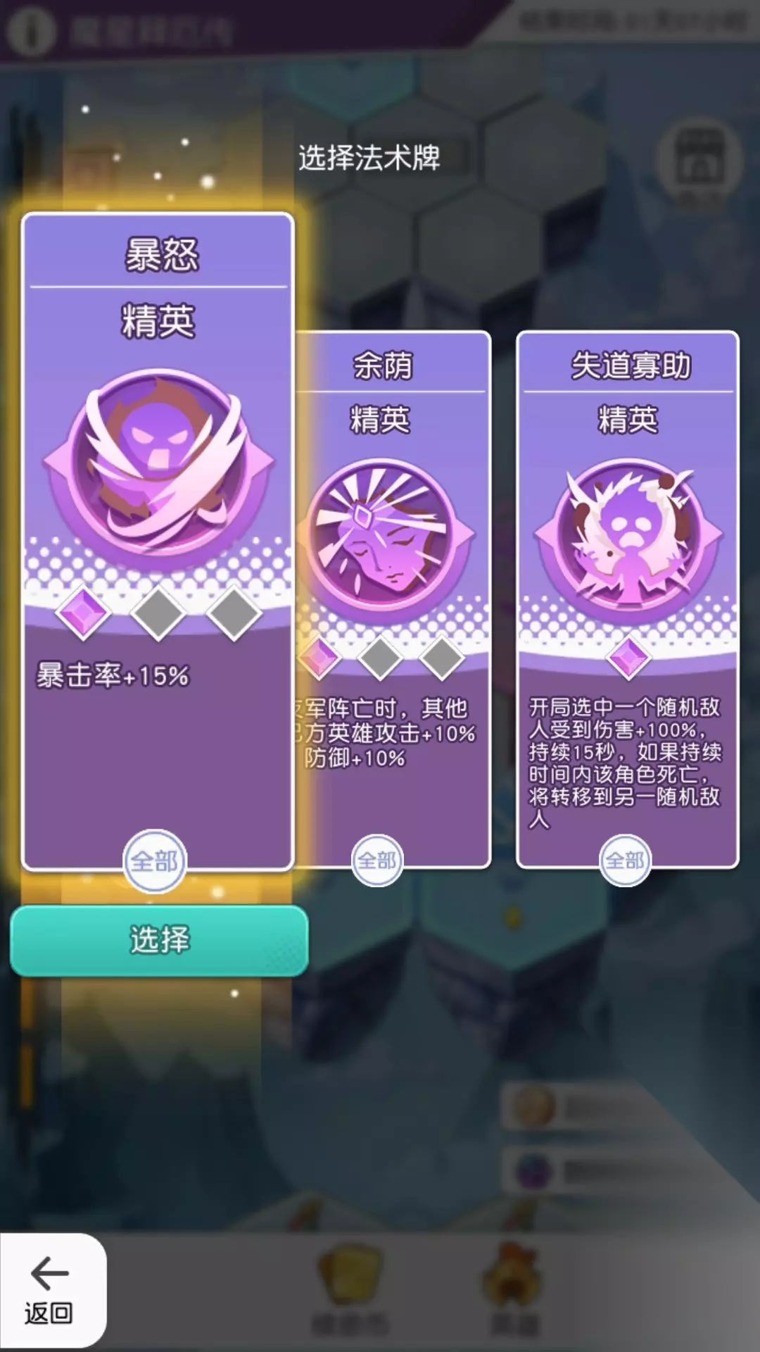 还有其他祝福等你挖掘,每次它随机出现。 3.精英法术牌:随机三张功能不一的法术牌,让你战斗更轻松。 可根据需求选择和升级,这里建议选择可以升级三次的法术牌,如下图所示,暴怒,余荫法术牌,都带有3个方块的,可以升级三次。例如暴击率提升等。 4.复生:随机复活一名已阵亡的英雄,并回复一半能量,如果无人阵亡,那么血量最低的英雄获得此回复。 5.太白金星:随机出现稀有,精英,史诗的法术牌