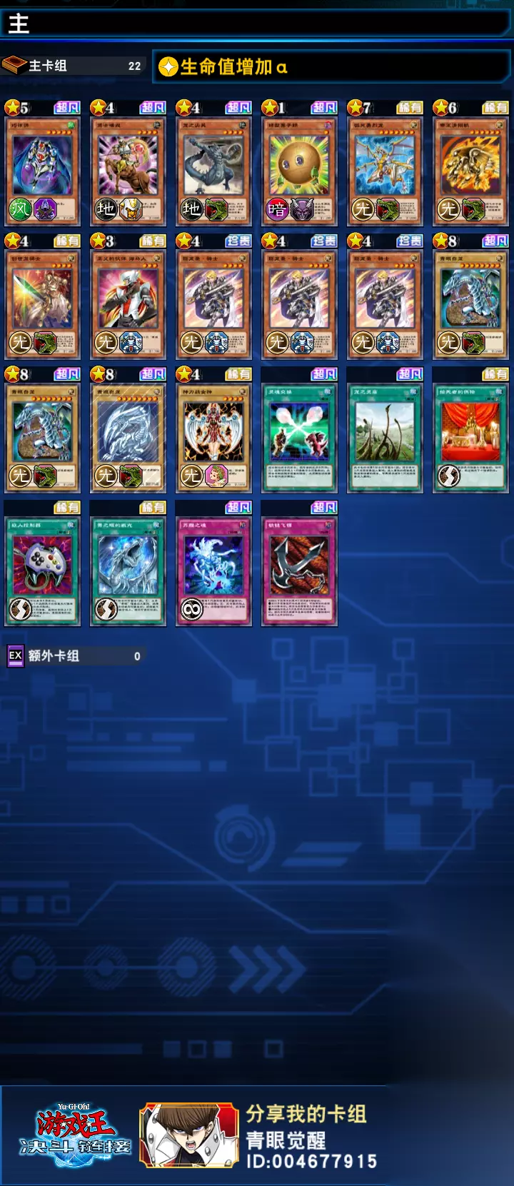 我的想法:这副卡组是我迄今为止能组出来肝度是我可以接受的平民卡组,不是那种氪金的,这副卡组不卡手能虐次时代,而且一般也不怎么卡 玩法:优先丢白龙进墓地,摸到 白龙圣·骑士优先招白龙装上,然后再丢弧光龙,之后就是无脑斧王操作了 Ps:龙庙可以换成其他从卡组丢牌的卡,三白龙可以换成俩白龙不过卡手概率高,图中1800攻的怪可以换成其他1800或更高的四星及以下等级的怪,不过 创世纪龙骑 不能不带,图中解场的魔法卡和陷阱卡也是可以替换的,必带的是“一张弧光龙 2-3张白龙圣·骑士 1-3张创世纪龙骑 2-3张白龙 0-1张龙庙”就这些,其他的可以找更好的卡来替代,但我自己的卡就这么少,次时代想凑齐8*500*3+5*500=14500最多14500左右,但我这卡10000以内可以出,就是海马要肝到40级,我大概肝了满25个小时才满级的,酌情考虑吧,氪金大佬就不用这么肝,前期基本氪金强,后期才有肝的地位 b服的能加就加个好友呗,欢迎提意见