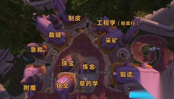 魔法商业区是一个可以学习各种专业技能(除了烹饪和钓鱼)的地区,如果你是工程学专业,还可以使用蒸汽动力拍卖师来使用拍卖行(需要工程学350点)。珠宝店内还有出售能够传送至达拉然的戒指。