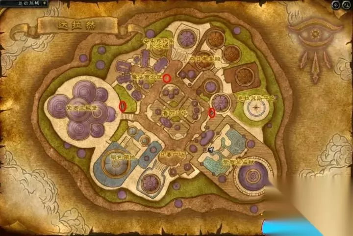 别忘了达拉然还有一个隐藏的地下世界,入口位于上图红圈标记的位置,其中包含着意志竞技场、咒语和乌鸦旅店等区域。
