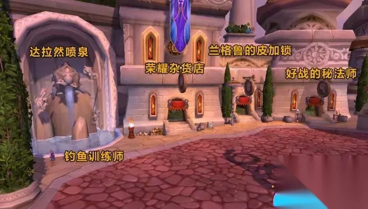 鲁因广场是一个多功能区,包含中立旅店、玩具店、传送门和公会注册等。命运丝线是一家布甲商店,一楼提供布甲套装部件兑换,二楼有牌子披风和鞋子(不同护甲类型)。奇妙玩具店出售各类玩具。魔术旅馆是达拉然的中立旅店。紫罗兰之门是法师训练师,提供达拉然传送门训练,传送:达拉然(需要71级),传送门:达拉然(需要74级)。达拉然访客中心有公会注册员和战袍商人等。摩尔珍品店一楼出售饰品和传家宝装备,二楼有出售副手和圣物商人(圣契、神像、魔印和图腾)。