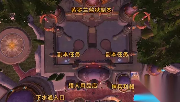 紫罗兰监狱 这里除了紫罗兰监狱副本外,还有接取副本日常的任务NPC,还有两个商店等,其中神兵利器内有牌子匕首、拳套和投掷武器兑换,对了,下水道入口之一也在此处哦。