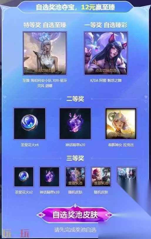 领取及自选说明 1.产出的所有皮肤道具将优先发放至玩家当前绑定大区。 2.获得的圣堂花火将正常发放至玩家绑定大区,请登录客户端——战利品——查看使用。 3.自选奖池时玩家可以选择当前大区已解锁皮肤,产出后玩家可选择将皮肤发放至未拥有大区。 4.随机皮肤宝箱将优先产出玩家当前绑定大区未解锁皮肤。若玩家已解锁奖池内所有皮肤,将随机产出一款皮肤,玩家可选择将皮肤发放至未拥有大区。 5.优先未解锁基于游戏背包,请及时领取道具。 6.玩家在首次开启召唤前,可自由调整自选奖池;玩家开启召唤后,最多可调整一次自选奖池。