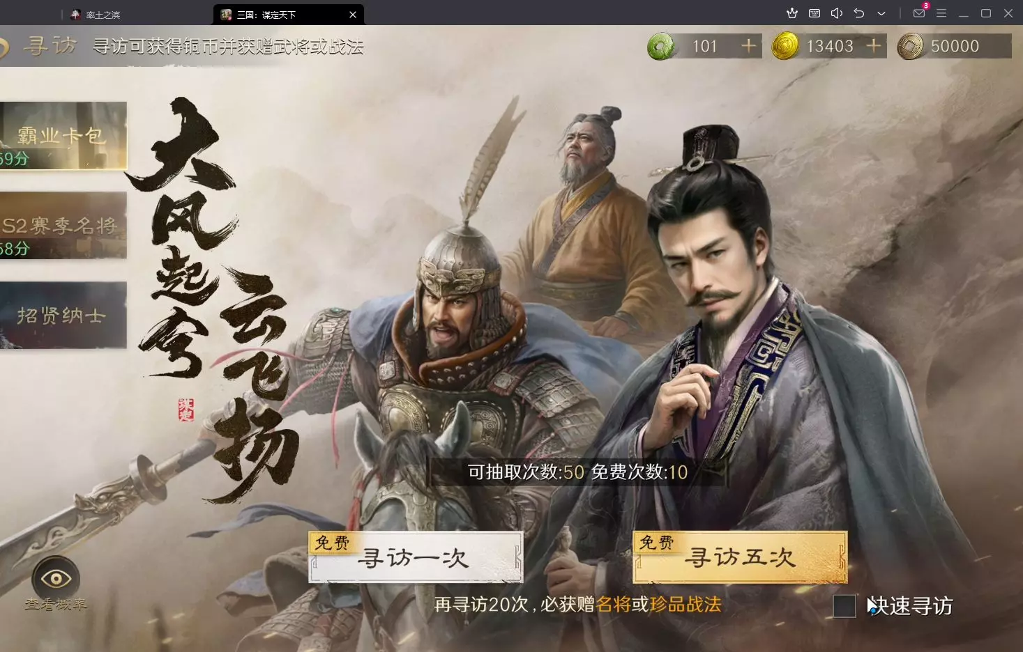《三国志·战略版》玩家攒了五万多月卡资源,在新赛季霸业二卡池试水招募武将,仅获得张曼成等武将,称只满足了最低要求,还收获了赛季功勋奖励。