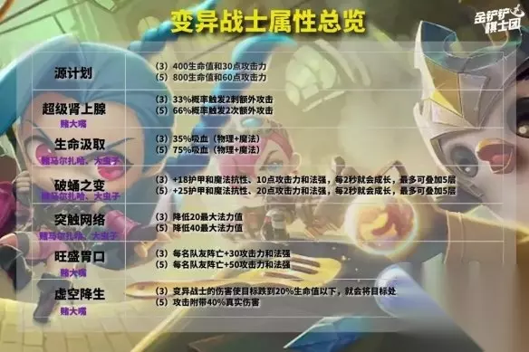 3.变异战士的搭配选择 变异战士是决定了这套阵容后期的战斗力上限。首选《破蛹之变》这个是我们以前版本的森林羁绊,5变异战士能够在战斗后期提高高额的双抗和攻击法强加成,如果是《破蛹之变》则必须开5变异。 其他变异战士除了《虚空降生》、《旺盛胃口》后期可以考虑开5变异战士以外,其他变异属性都不要开。而是否决定要开5变异,主要决定于卡莎是否有2星。