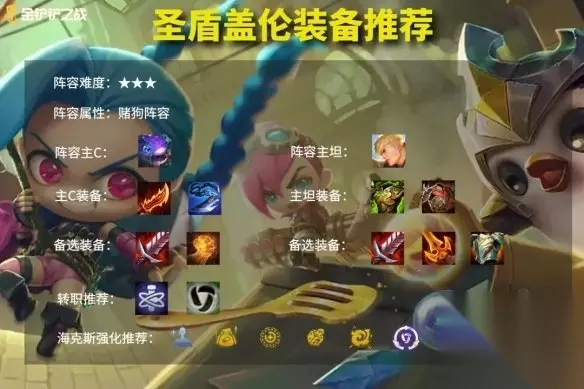 四、运营攻略 圣盾盖伦是一套无须运营的赌狗阵容,核心卡牌都是1、2费卡,中后期的阵容运营主要是根据海克斯强化选择后续发展路线,当前版本因为有海克斯强化这种特殊机制,无论是运营阵容还是赌狗阵容都是有非常不错的选择。运营阵容过渡更加平滑了, 阵容运营主要是前期拿体系卡牌攒50利息,到5人口卡利息追3星阵容,前期一般来说如果没有拿到《D到上头》和《DD街区》这两个海克斯强化的话,是可以走连胜运营路线的。没有这些特殊的海克斯强化,一般建议直接除了体系卡牌以外尽量别拿,卖血卡经济。