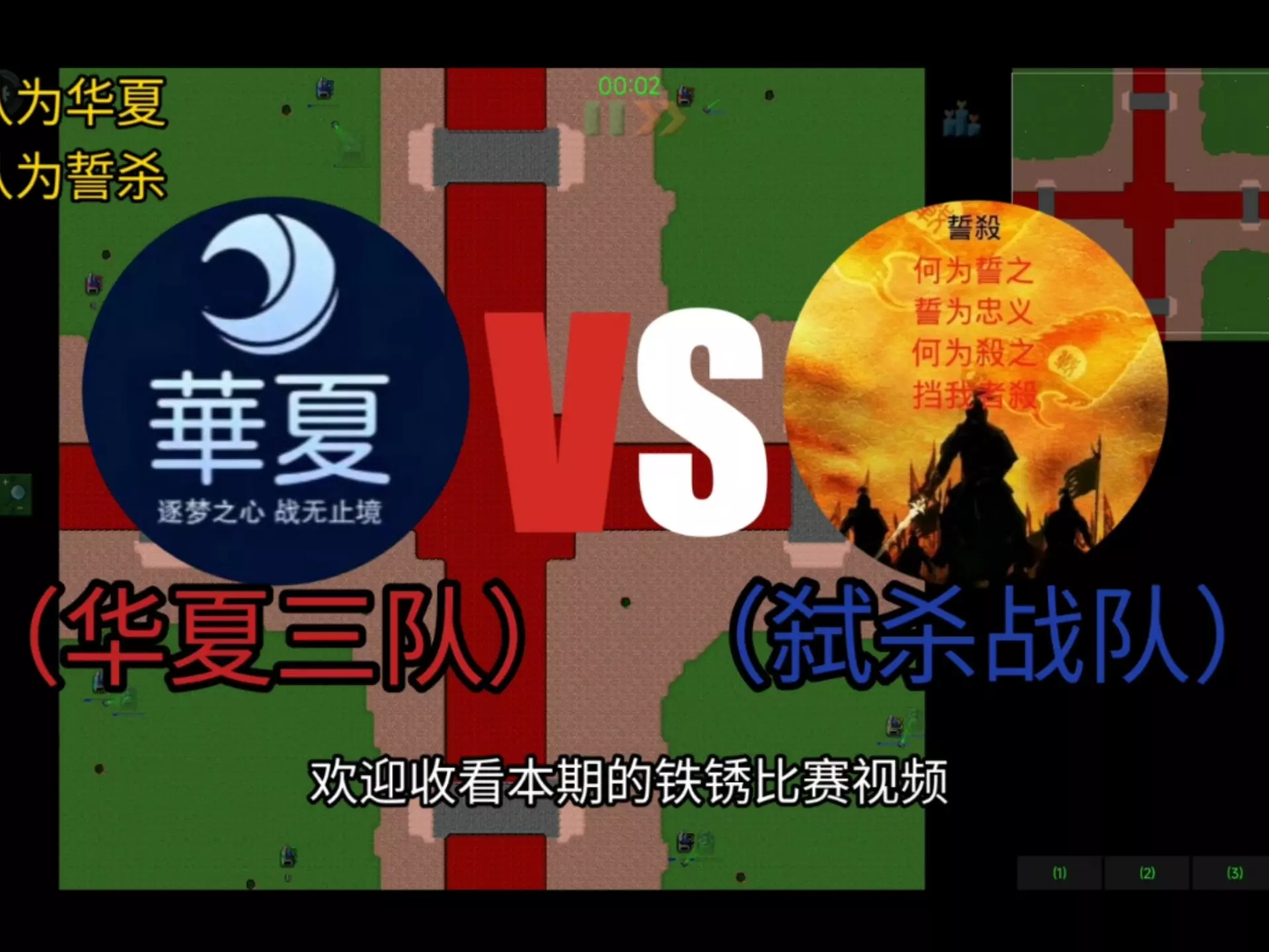 这是一则《铁锈战争》的招人帖,为游戏内的华夏三队招募成员,同时展示了《铁锈战争》的对战地图画面,该游戏是一款策略对战类游戏。