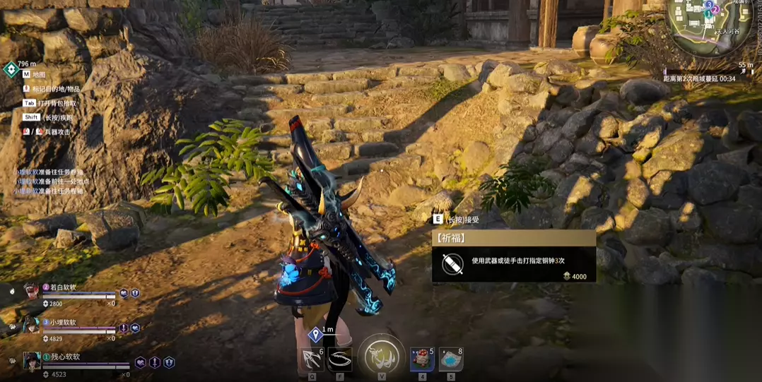 地图上的任务主要分为祈福、探索与悬赏等不同类型,每种任务都有其特定的触发与完成机制。祈福任务表现为敲钟,玩家根据地图提示抵达目标位置的钟处,使用武器或徒手敲击三次即可完成,并获得暗潮币作为奖励。探索任务则更为多样,例如在神鹰堡解密圣鹰像、在长生寨安装捕兽夹、以及在麦赫塔区域寻找并互动仙人掌等,完成这些探索行为通常能解锁宝箱或获得特殊物资。地图上还会随机出现代表悬赏任务的紫色标记和代表普通任务的黄色标记,其中黄色任务除了敲钟,还可能包括寻找宝箱或祭拜土地庙等。