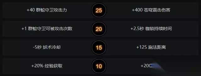 技能一、苍穹震击 利用虚空能量制造出分叉的闪电,打击多个敌方单位。 最远可以伤害1000距离外的次级单位。 魔法消耗:100/120/140/160 冷却时间:14/12/10/8 技能:单位目标 伤害类型:Magical 目标数:1/3/5/7 伤害:140/200/260/320 技能二、妖术 将一个敌方单位变成人畜无害的动物,使其无法攻击和使用技能。 立即摧毁幻象。 目标的基础移动速度为100,但是如果目标有满速状态则移速不受影响。 妖术将使伤害格挡无效。 魔法消耗:70/110/150/190 冷却时间:13 技能:单位目标 持续时间:1.25/2.0/2.75/3.5 技能三、枷锁 持续施法 - 使用魔法绑住一个敌方单位,使其无法攻击和移动,同时持续造成伤害。 魔法消耗:140/150/160/170 冷却时间:16/14/12/10 技能:单位目标, 持续施法 伤害类型:Magical 总伤害:60/160/260/360 最大持续时间:2.75/3.5/4.25/5 技能四、群蛇守卫 召唤10支毒蛇守卫来攻击敌方单位和建筑。守卫对魔法免疫。每个守卫受到两次攻击就会被摧毁。 魔法消耗:200/350/600 冷却时间:120 技能:点目标 伤害类型:Physical 攻击力:50/80/110 持续时间:45.0/45.0/45.0 神杖升级攻击距离加成:225 摧毁所需次数:2 英雄属性