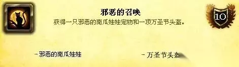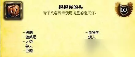 10、摸你的头 达成条件:对游戏中的所有十个种族使用沉重的南瓜灯。沉重的南瓜灯主要由无头骑士掉落,同时日常任务也会给予你一定数量的南瓜灯,在拥有足够数量之后,呆在达拉然找其他种族使用吧。不过这也许不适用于阵营对比悬殊的服务器,那么你可以选择战场来完成此成就。
