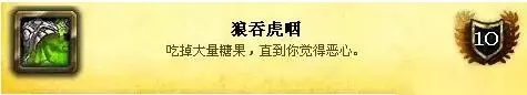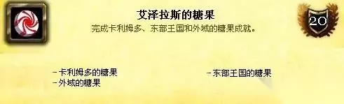 6、艾泽拉斯的糖果 达成条件:完成另外3个成就——卡利姆多的糖果,东部王国的糖果和外域的糖果。你需要做的是跑遍旧艾泽拉斯大陆和外域的所有旅店,从每个糖罐中获得糖果。如果想最快速度获得所有糖果,建议你先了解一下所有提供糖罐的旅馆所在,规划一个合理的路线来完成成就。