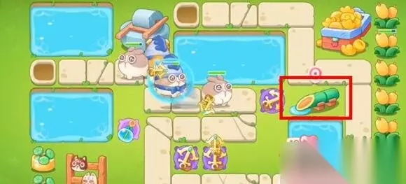 7、接着第五波我们要注意小心吊索兔,进入第六波尽早拆除水上道具,炮塔放置位置如图所示。