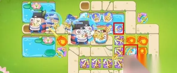 5、我们第三波在竹子空位建造火炮瓶,锁定上方钱箱,拆除顺序如图所示。