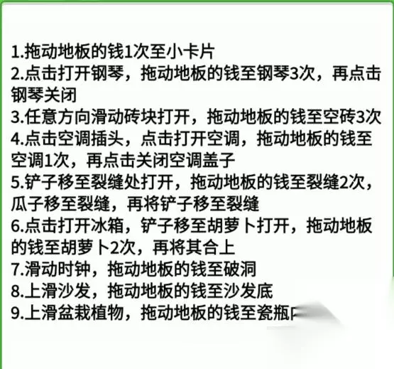 1、拖动地板的钱1次至小卡片 2、点击打开钢琴,拖动地板的钱至钢琴3次,再点击钢琴关闭 3、任意方向滑动砖块打开,拖动地板的钱至空砖3次 4、点击空调插头,点击打开空调,拖动地板的钱至空调1次,再点击关闭空调盖子 5、铲子移至裂缝处打开,拖动地板的钱至裂缝2次,瓜子移至裂缝,再将铲子移至裂缝 6、点击打开冰箱,铲子移至胡萝卜打开,拖动地板的钱至胡萝卜2次,再将其合上 7、滑动时钟,拖动地板的钱至破洞 8、、上滑沙发,拖动地板的钱至沙发底 9、上滑盆栽植物,拖动地板的钱至瓷瓶内