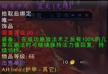 【暗月卡牌:蓝龙】对应野兽套牌,收集齐野兽之一~野兽之八才能兑换此饰品。 其中除了野兽之一需要通过刷黑上BOSS比斯巨兽获取之外,其他七张皆为世界掉落,刷50级以上的怪(包括副本里的)都有几率获得。 收集齐八张野兽卡牌后,右键背包中的任意一张,可以把八张牌合成为任务道具【野兽套牌】。 此时右键【野兽套牌】,可触发任务【暗月野兽套牌】,这时候你就可以去找暗月马戏团的NPC【萨杜斯·帕雷教授】兑换饰品了。 【暗月卡牌:蓝龙】的效果如下图(几率100%是插件写错了,其实是2%)