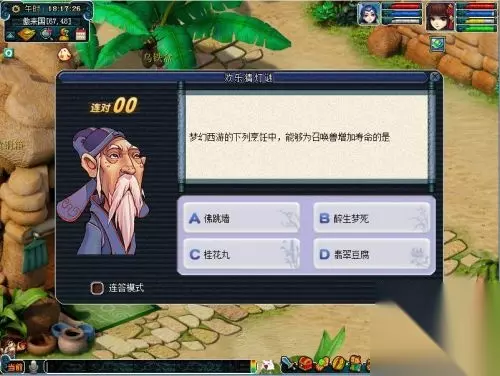 活动开始后,3位灯谜老人每小时会分别出现在傲来国、西梁女国和宝象国,并停留15分钟。找到"灯谜老人"猜灯谜,每答一题需要消耗15点体力,答对就可以获得1点灯谜积分。玩家可以在长安城(290,190)和建邺城(90,64)的NPC"卖元宵的小兔子"处,用灯谜积分选购节日里的特色美食——元宵。 梦幻西游2018元宵节欢乐猜灯谜答案汇总 猜灯谜活动攻略 答题时,玩家可通过勾选答题界面上的“连答模式”选项选择答题模式:若勾选则为连续答题模式,每答完一题后会自动出下一题并扣除15体力,直至知识老人离开或角色体力不足;若不勾选则为单次答题模式,每答完一题后答题界面将会消失,出题时扣除15体力。 特别说明 1、元宵兑换截止时间为2018年3月20日8:00,元宵没有使用期限。 2、每只召唤兽每年最多可以食用10颗元宵,其中"每年"的概念是按照自然年计算。即2018年1月1日到2018年12月31日期间,每只召唤兽最多只可使用10颗元宵,依次类推。 3、当召唤兽食用某种元宵时,相应的资质越低,提高资质的效果也越明显。 4、召唤兽某项资质达到上限后,玩家仍旧可以继续喂食对应种类“元宵”以提升该召唤兽资质,但超过上限部分的资质将于次年1月1日0:00衰减50%。 中国古代的“上元节”指的是哪个节日 答案:元宵节 中国传统节日中秋节是指哪一天 答案:农历八月十五 中国民间的“重阳节”是指哪一天 答案:农历九月初九 梦幻西游里能够提高防御的宝石是 答案:月亮石 梦幻西游里能够提高躲避力的宝石是 答案:神秘石 梦幻西游里查看宠物界面的快捷键是 答案:Alt+P 梦幻西游里阴曹地府的森罗殿有几个NPC 答案:11个 梦幻西游里麒麟山的太岁府有几个NPC 答案:3 梦幻西游里能提高活力上限的辅助技能是 答案:养生之道 梦幻西游里能提高体力上限的辅助技能是 答案:健身术 梦幻西游里乾坤盘对抗赛活动于每周星期几举行 答案:星期三 梦幻西游里130级的武器和装备可以开运多少个孔数 答案:5个 梦幻西游里不允许摆摊的地方是 答案:宝象国 梦幻西游里哪个NPC处可以存储获得的普通藏宝图 答案:宝石商人 梦幻西游里至少达到多少级后才能结婚 答案:30 古代“重阳节”里有饮酒的习俗,所饮的酒是 答案:菊花酒 元宵节赏灯的习俗始于什么时期 答案:东汉 我国古代所说的“醍醐”是一种 答案:美酒 胭脂是古代女子常用的化妆品,一般用来装扮 答案:腮部 被称为“花中四君子”的是 答案:梅、兰、竹、菊 梦幻西游里要兑换仙玉可以找以下哪个NPC 答案:桃源仙子 五岳之说自古就有,其中南岳是指 答案:衡山 明代针灸大师杨继洲是哪里人 答案:浙江 古代有赏花灯的习俗,被成为“灯节”的是哪一天 答案:元宵节 中国古代人们所说的“元旦”是指哪一天 答案:春节 “众星拱月”是哪种坐骑的装饰 答案:凌霄飞剑 古人泡茶注重用水,以下被视为上等茶水的是 答案:山泉水 梦幻西游里要提高召唤兽装备的能力可以镶嵌以下哪种物品 答案:精魄灵石 我国古代酿酒的主要原料是 答案:粮食 下列具有消肿止痛,凉肝定惊作用的一味中草药是 答案:重楼 下列哪种草药能够治疗呕吐泻痢 答案:黄连 中草药里“甘草”的入药部分实际是植物的 答案:根 古代所称的“杏林高手”是指 答案:医术高明之人 梦幻西游里熔炼技巧可以产出以下哪种材料 答案:钨金 喜好饮酒,自称“酒中仙”的著名诗人是 答案:李白 “煮酒论英雄”的典故发生时间最接近哪个时期 答案:三国时期 下面哪一种不属于装备特效 答案:吸血 “交杯酒”一般出现在哪种场合 答案:结婚喜宴 正月十五元宵节又称为“上元节”,那么“中元节”是指哪一天 答案:七月十五 古代被称为建筑业的鼻祖的是 答案:鲁班 以下哪个是古代著名“唐三彩”工艺中的基本色彩之一 答案:白色 被称为“玉石之王”的是哪种工艺原料 答案:翡翠 正月十五元宵节又称为“上元节”,那么“下元节”是指哪一天 答案:十月十五 我国古代以产醋闻名的是哪个省 答案:山西 “景泰蓝”工艺品的主要原料是 答案:铜 梦幻西游里召唤兽仓库每间能存放最多几只召唤兽 答案:10只 古诗名句“采菊东篱下”的下句是 答案:悠然见南山 古诗名句“郎骑竹马来”的下句是 答案:绕床弄青梅 “山城”是我国哪座城市的雅号 答案:重庆 下列哪座山是我国四大佛教名山之一 答案:峨眉山 春秋时期“卧薪尝胆”最终灭掉吴国的是 答案:越王勾践 三国时期“割须弃袍”的是 答案:曹操 秦始皇统一全国后,规定国家通用的货币是哪一种 答案:圆形方孔钱 中国古代最早的货币是由什么材料制成的 答案:贝壳 古代战场上常见以马牵引的战车,这类战车均为 答案:两轮车 中药里所说的“陈皮”是指 答案:晒干的橘皮 中药“胖大海”的主要功效是 答案:润喉止咳 中药里的“雄黄”属于 答案:矿物 以下“不是”花茶中常用原料的是 答案:君子兰 以下“不是”古代药酒常用原料的是 答案:鸡尾 在梦幻西游里,哪项属性的点数分配对“灵力”的影响最大 答案:魔力 佛教所称“圆寂”是指 答案:佛门中人去世 五岳中被称为“北岳”的是 答案:恒山 我国最大的佛像是下列哪一座 答案:乐山大佛 道教名山武当山位于哪个省 答案:湖北省 牌坊是我国古代传统建筑,梦幻西游里的“安定坊”位于哪里 答案:建邺城 被称为“天下第一关”的是 答案:山海关 “五禽戏”起源于汉代,它属于 答案
