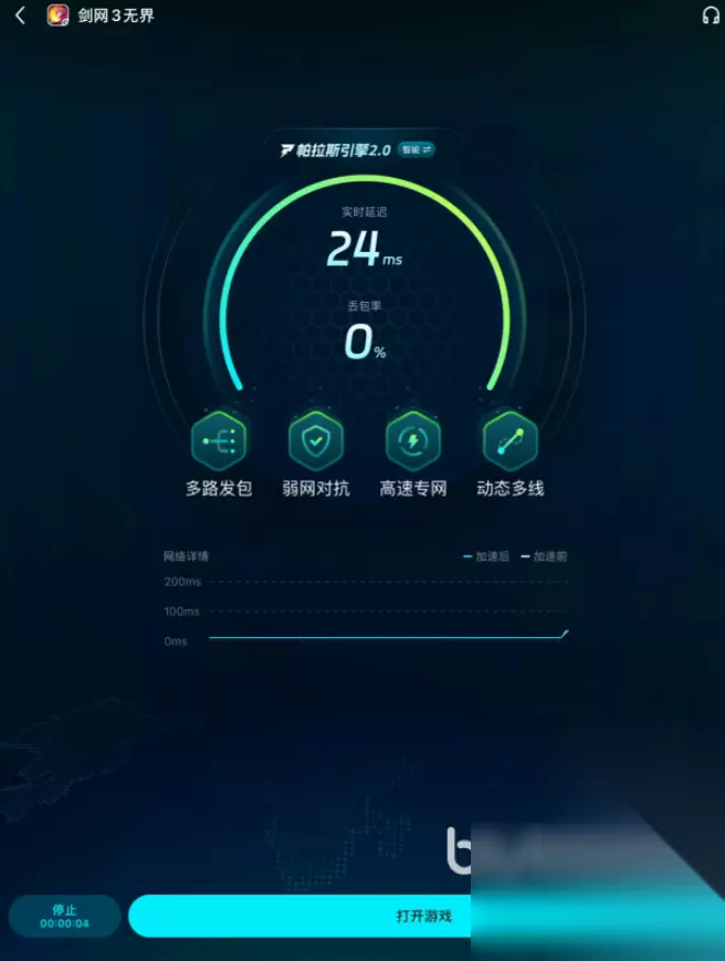 在加速的界面上,你可以查看当前的加速延迟数值和丢包率等详细信息,实际地感受到手感变得流畅。如果暂时不需要加速,也可以选择下方的【停止】按钮,灵活控制加速状态,随开随停,个性化服务很贴心。