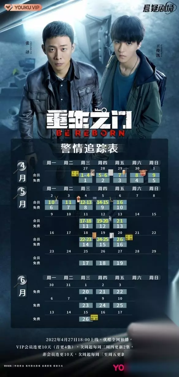 重生之门更新时间 一、更新时间 该剧于2022年4月27日在优酷独家播出 VIP会员连更10天首更4集,次周起每周三周四更新2集,周五更新1集,非会员连更10天,次周起每周三至周五更新1集! 二、追剧日历