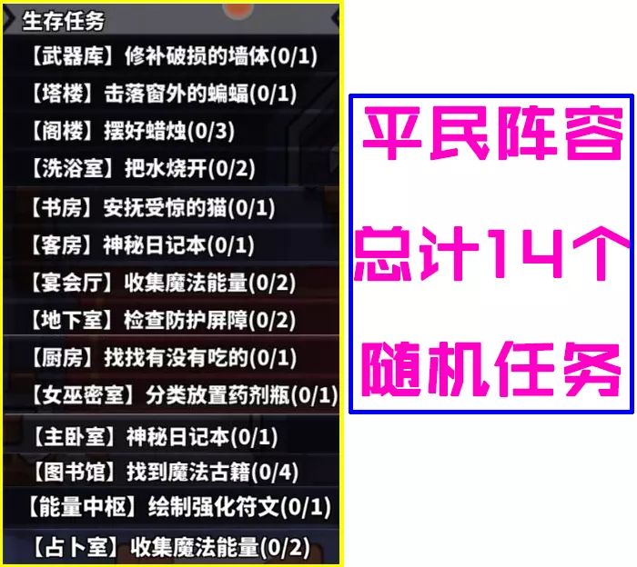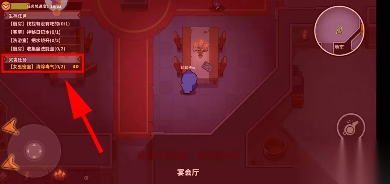 除了14个基本任务,平民还有4个紧急任务,级别最高,优先级是第一。限定时间30秒,由狼人触发。要是30秒内没完成,平民直接失败。这4个任务分别在女巫密室、地下室、客房、占卜室。