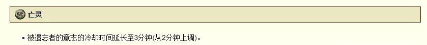 当然这和我们现在看到的亡灵意志差别依然很大,因为之后亡灵意志还受到了数次削弱。如免疫控制的时间从20秒砍到了10秒,当然这不算什么,10秒之后又砍到了5秒,亡灵意志此时就需要一些使用技巧了,但是双解控的comb依然存在,砍时间的改动都不算动筋骨。 直到亡灵意志改成了和章共CD,才让亡灵走下神坛。一开始亡灵意志和章的CD并不重叠,而是其中一个被使用之后,另一个进入CD30秒。之后又一步步削弱,WOD时期,甚至CD被砍到了3min。