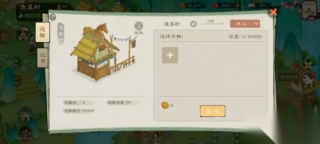 我们可以点击选择货物那个加号,把建筑所需要的货物给放上去,然后运到鱼溪村去 我们有资源之后就进行建造建筑