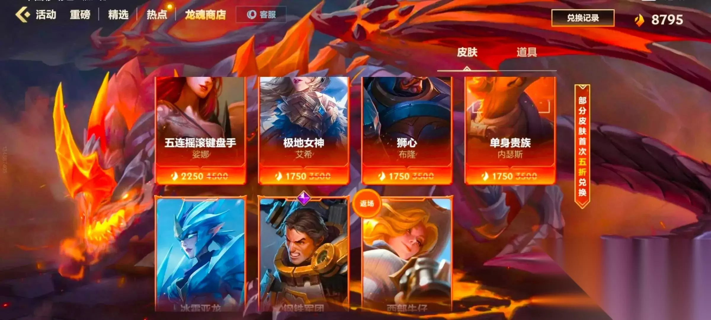 龙魂商店的统统都想要,但龙魂石却只有8795个。 每一个得来不易,天天中午晚上打卡,参加各种活动才凑齐了这么多,虽然龙魂商店皮肤不少,但感兴趣的没几个。
