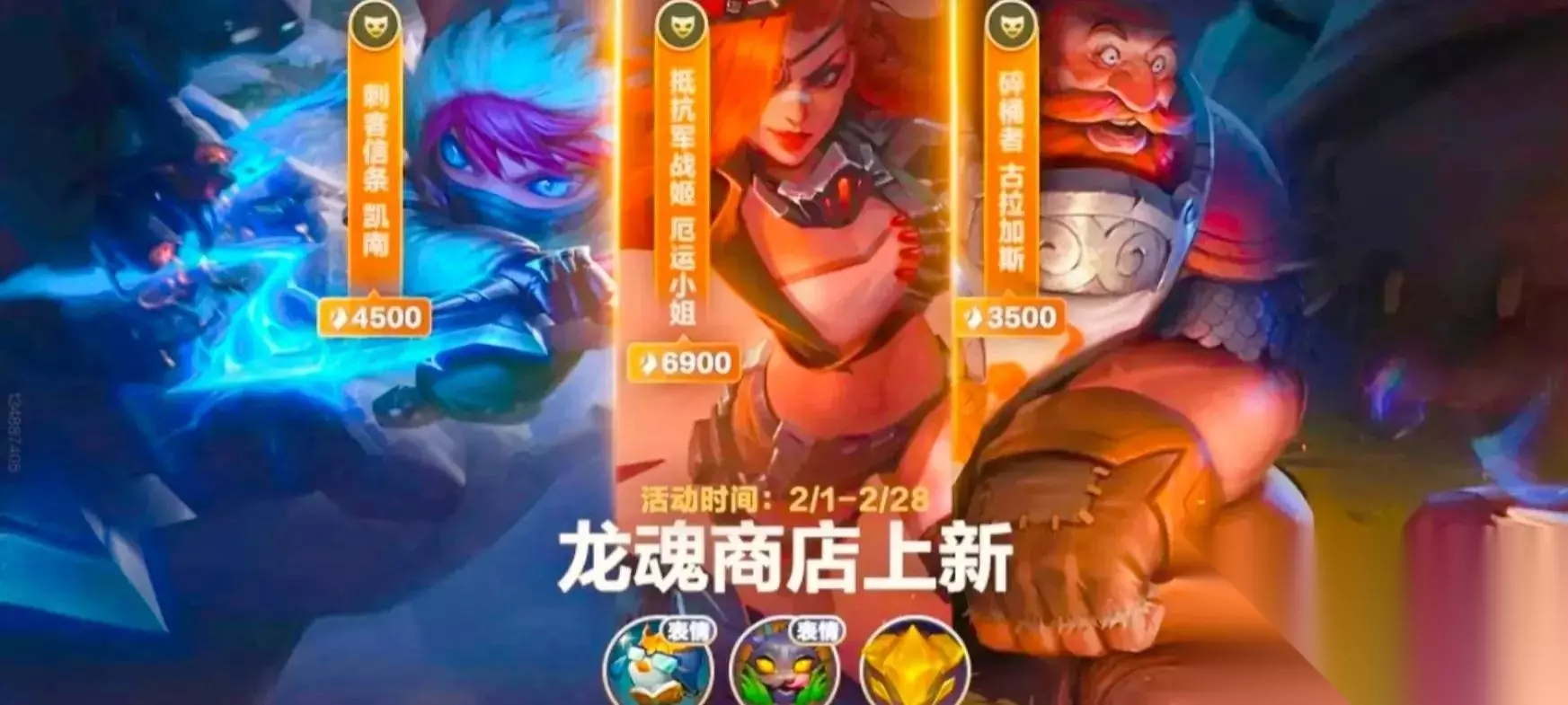 2月1号到2月28号,龙魂商店将上架新皮肤,有抵抗军战姬厄运小姐,还有凯南刺客信条,古拉加斯碎桶者。