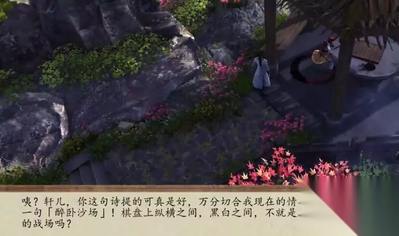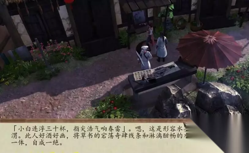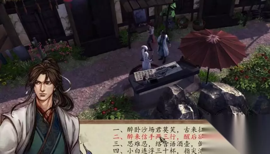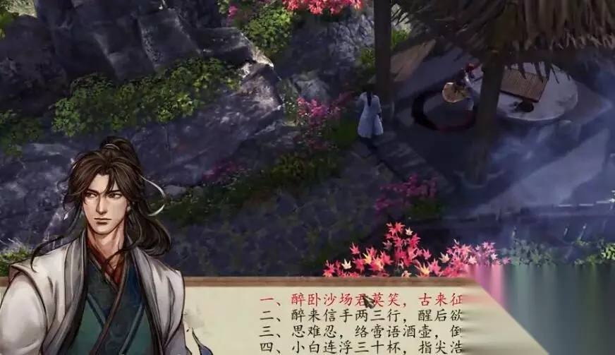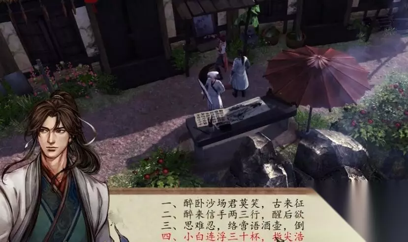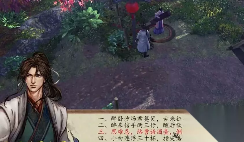 四句诗歌对应四个NPC,完成之后和酒仙对话,获得一部醉拳秘籍和一个酒仙葫芦。 一、醉卧沙场君莫笑,古来征战几人回 对应:棋