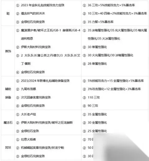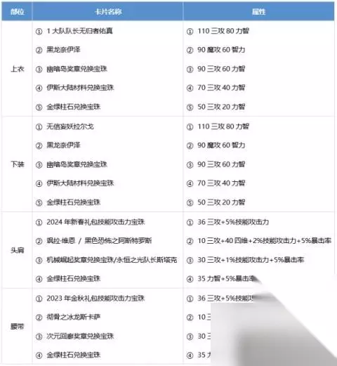 【二】装备附魔 查询其他过渡卡片请善用游戏内【卡片辞典】功能。 以下各部位宝珠按优到劣从上往下牌序,按序号对应属性 礼包宝珠选择:技能攻击力系列