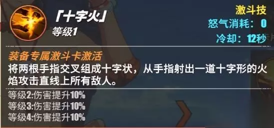 技能CD 12秒艾斯将双手手指十字交叉,从手指间射出一道十字火焰,对火焰前方的敌人造成伤害,并且直接击退