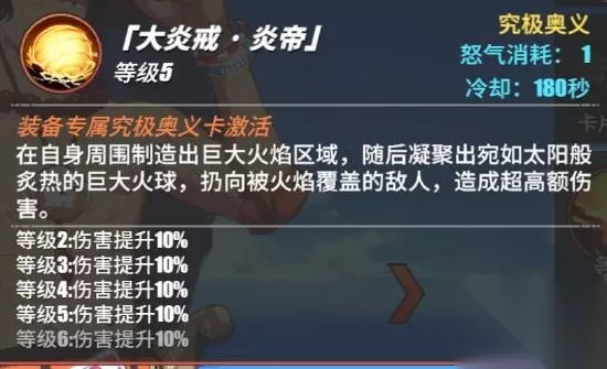 火拳的技能分为两段输出,第1段是6000,第2段是9000,技能的CD是比较短的,能在短时间内打出我们所需要的所有输出,而且在场上对局的时候,技能是有超远距离的攻击状态,可以使用技能打远程的伤害输出(当双方的距离比较近的时候,那么火钳就会向下扔出,距离较近的情况下释放完小奥义,我们是可以接上自己的普攻去打输出伤害的) 技能的释放特点 我们技能的CD和释放速度都是比较快的打伤害的速度也是比较快的,所以在对局的时候,我们可以利用我们CD较短的特点多次使用这个技能,对敌方造成伤害,在我们释放怒气值充足的情况下,可以利用这个技能来打伤害(技能的伤害一般都是在15,000~16,000左右) 究极奥义 炎帝 大炎戒