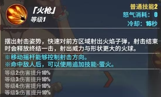 技能CD 18秒艾斯摆出射击的姿势快速对敌方区域射出火焰子弹,射击结束时会释放,终结一击射出威力与形状更大的火球,对敌方进行攻击(在释放技能的时候,我们可以通过摇杆来控制我们火枪所射击的方向,同时命中敌方以后,我们会解锁第2段的二技能)