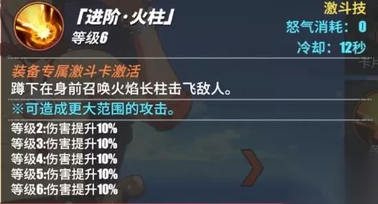 这个技能对前方的敌人可以有一个很好的击退效果,而且攻击的范围也是比较可观的,但是基本都是向前方进攻,但是没有被左右的控制伤害 (在正常对局的时候,我们可以利用这个技能来面对那些想要对我们起手的敌人,我们可以直接利用技能将其非霸体的攻击状态直接打断) 激斗技:进阶 火柱