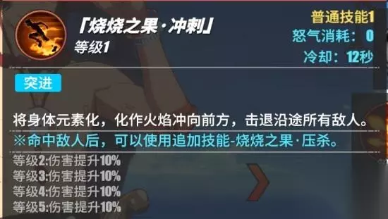 冷却12秒艾斯使用烧烧果时的能力,将自己的身体进行元素化,化作火焰跑向对方,击飞沿途中的所有敌人,当我们第1段攻击到对方的时候,那么就可以解锁下一段的技能(技能的第1段是有元素化效果的,在元素化的时候对方是打不到我们的,无法对我们造成伤害和控制)