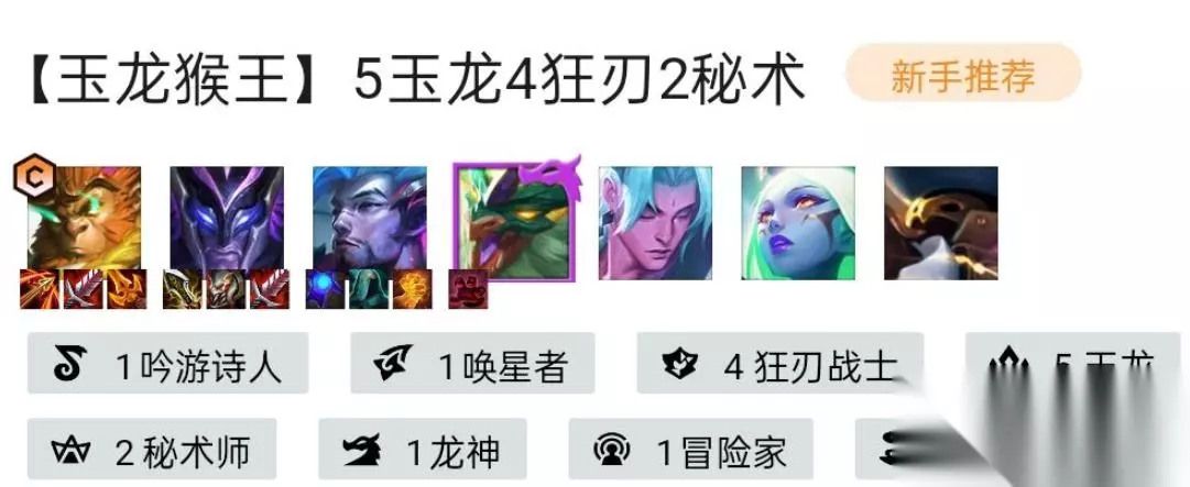 1,在云顶之弈的S7.5中,玉龙阵容的组成是:猴子,潘森,亚索,石傲玉,永恩,奶妈和巴德。