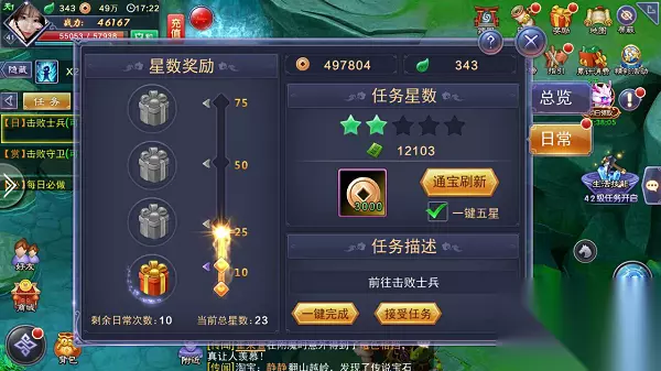 货物装船 将货箱所需物品装进对应的箱子中可分别获得通宝、经验、元能、星源的奖励;装满所有货箱后点击出发还可以获得额外的奖励。玩家可以点击【求助】或者【帮助】按钮向好友或者帮会成员求助或者帮助他们装箱。 任务内容 【日常任务】、【帮会任务】、【悬赏任务】、【阵营任务】、【周跑环】在任务系统中有统一展示,玩家通过完成相应任务获得不同的奖励。