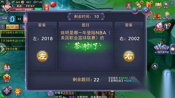 藏宝图 玩家每日有3次免费寻宝的机会,依据藏宝图提示在相应地点挖宝,有机会打败宝物守卫者获得图鉴碎片等奖励;玩家可以通过购买藏宝图增加寻宝次数。 答题 玩家每日可进行30次答题,答对获得全部经验奖励,答错获得一半经验奖励;玩家答对的三个类型题目连成一线后,即可进入下一关。