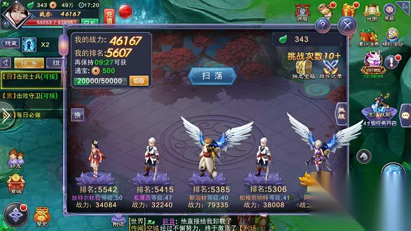 竞技场 玩家每次进行挑战时,系统会根据你的当前排名随机抽取5名玩家以供选择。如果对当前的候选玩家不满意,可以点击左侧“换”按钮刷新候选名单。玩家可以在界面左上角查看自己当前战力、排名,作为选择挑战对象的重要参考指标。 若挑战成功,就可以和挑战对象交换排名。若挑战失败,双方排名不会发生改变。无论挑战成功与否,每天都有10次免费挑战机会。 此外,对于排名前三十的风云人物,可以在右侧“挑战”面板中对刑天发起挑战,战胜后同样可以获得丰富奖励。