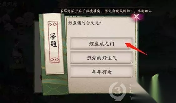 阴阳师鲤鱼旗的含义答案分享 选项:1、鲤鱼跳龙门,2、恋爱的好运气,3、年年有余 正确答案:1、鲤鱼跳龙门 鲤鱼旗的含义!选第一个!不是第三个! 虽然我觉得年年有鱼才更好喵,不过人类就是这样让喵无法理解; 青森之秘活动 此次的活动为寮友集体活动内容,每日需要管理员选择区域进行探索。然后寮友们可以自由参与活动。活动内容需要寮友们同心协力的解开各个板块,然后获得板块奖励。开启下一版块内容,丰富的奖励。