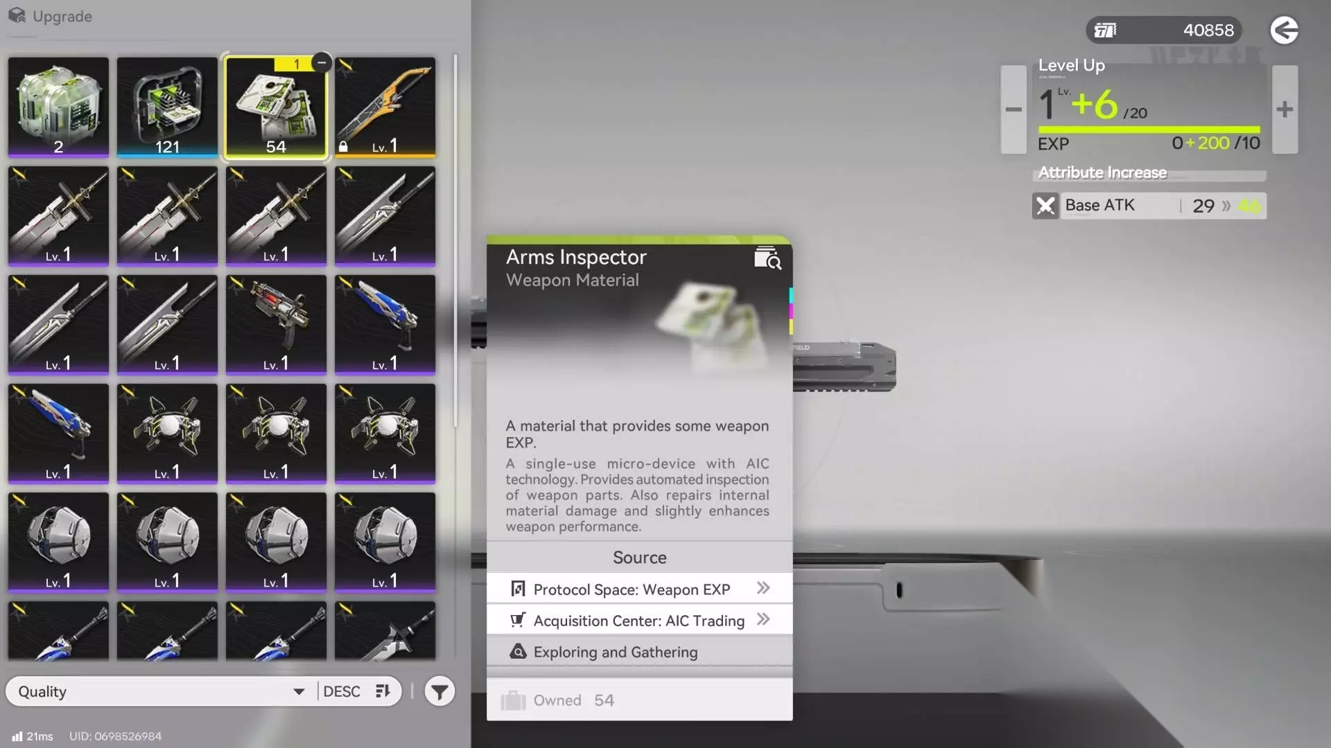 你可以使用武器检修零件来升级武器。这些可以通过任务奖励、探索和完成协议空间任务获得。你也可以在 AIC 进行兑换。 或者,你可以使用其他武器作为素材。三阶武器提供 500 经验值,四阶提供 1500 经验值,以此类推。 提升武器潜力