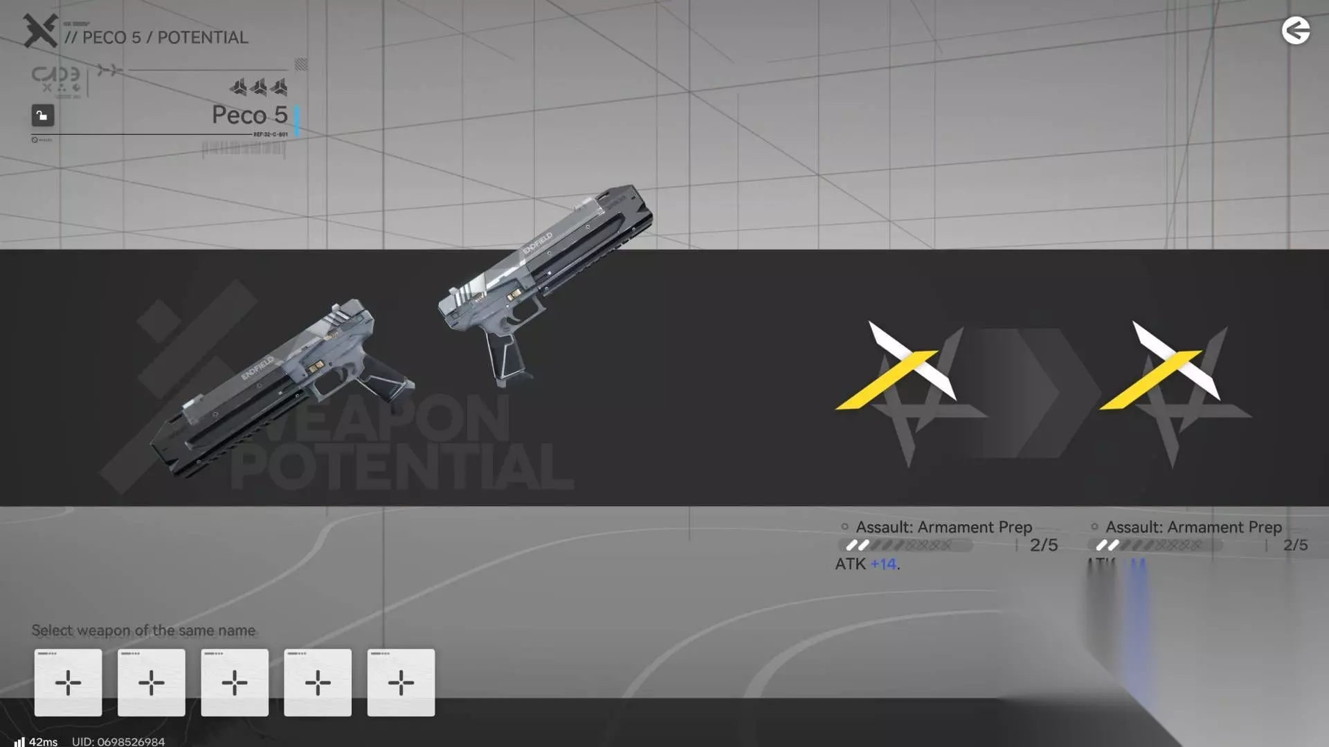 你还可以通过消耗同名武器进行合成来提升武器的潜力。提升武器潜力会为武器属性提供固定加成。 如何校准你的武器 (20级)