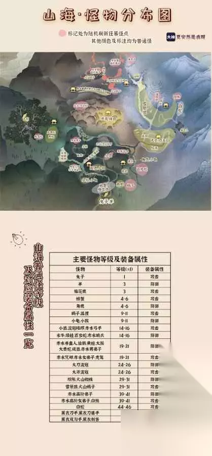 逆水寒山海怪物分布图一览:在这款游戏中想必不少玩家对于逆水寒山海怪物分布图一览不晓得如何玩,毕竟新人开局体验也是有些难搞的,小编整理了逆水寒山海怪物分布图一览介绍,下面一起来看看相关的信息。 逆水寒山海怪物分布图一览 山海里面的小怪分为:普通怪、狂暴怪和精英怪。 在日常的任务里,完成任务基本会遇到这几种情况: 1.任务·地:打精英怪(1只) 2.任务·黄:打普通怪(数只) 狂暴怪,则是我们刷橙装及完成赛季挑战·战斗中会遇到。 图一标注的精英怪,因为比较分散,所以给出的是离传送点近的位置。 图二标注的是山海普通怪及狂暴怪位置,按照大量加标注的方式,给出的范围。 在图中用淡粉色标注出来的位置,是常见狂暴怪的范围,更方便完成任务。 图三及图五是单独的精英怪及全图怪的大图,方便保存。 图六为主要怪物及装备属性,方便提升自身装备及属性。