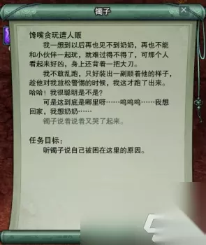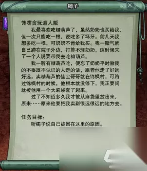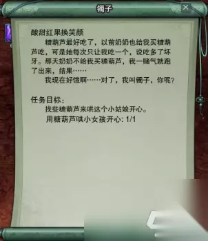 原来她因为想吃糖葫芦而轻信了坏人的话,被人贩子拐卖到了融天岭,再接着我们会接到一个让我们帮她到成都找奶奶的任务: